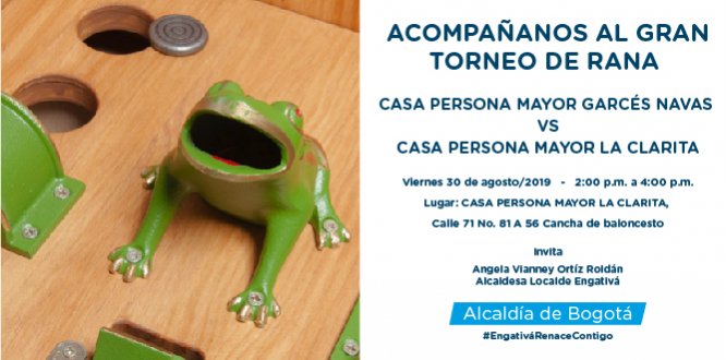 La Alcaldía Local de Engativá ha priorizado realizar actividades que promuevan nuevos escenarios para el disfrute del tiempo libre de las personas mayores de la localidad. Te invitamos a participar del torneo de rana que se llevará a cabo el viernes 30 de agosto de 2019 en las dos casas de Persona Mayor de Engativá.