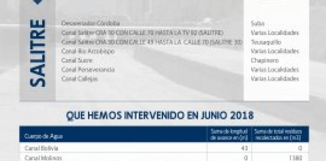 Este Convenio inició en el año 2014 y hasta la fecha, se han recolectado más de 330.000 M3 de residuos, de 196 cuerpos de agua de la ciudad, correspondiendo la mayoría de ellos a escombros, residuos domésticos, llantas y electrodomésticos que son arrojados a los canales, ríos, quebradas y estructuras por parte de la comunidad.