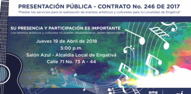 La Alcaldesa Local de Engativá Ángela Vianney Ortíz, invita a la comunidad engativeña a participar en la presentación pública del Contrato de Prestación de Servicios Nº 246 de 2017 que tiene por objeto prestar los servicios para la realización de eventos artísticos y culturales para la Localidad de Engativá.