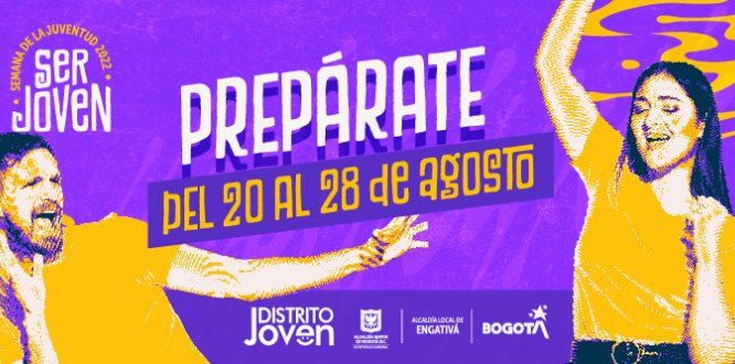 Bogotá D.C., 9 de agosto. A partir del 20 al 28 de agosto los y las jóvenes de Engativá podrán participar de las actividades que se tienen preparadas para la Semana de la Juventud: “Ser Joven”, con el fin de promover y fomentar acciones de participación y aprendizaje en 6 ejes temáticos: Deportivo, Cultural, Ambiental, Tecnológico, Económico y de Salud.